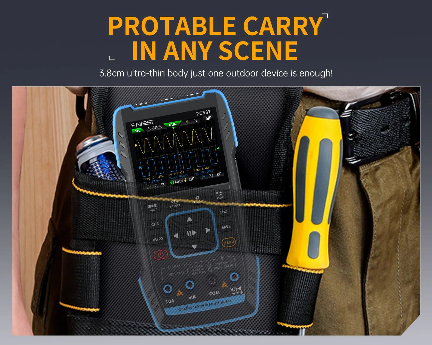 The built-in DDS function signal generator can output 13 types of function signals, with a maximum output frequency of 50KHz and a step size of 1Hz. The output frequency, amplitude, and duty cycle are adjustable. It features a 2.8-inch 320*240 resolution high-definition LCD screen and a built-in 3000mAh rechargeable lithium battery with a standby time of up to 6 hours. Its compact size provides users with more powerful practical functions and excellent portability.