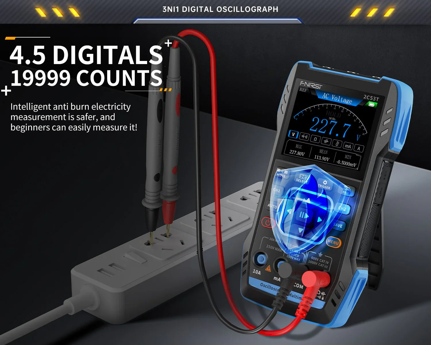 The multimeter function offers 4.5 digits with 19999 counts true RMS, supporting AC/DC voltage and current measurements, as well as capacitance, resistance, diode, and continuity measurements, making it an ideal multifunctional instrument for professionals, factories, schools, enthusiasts, or home use.