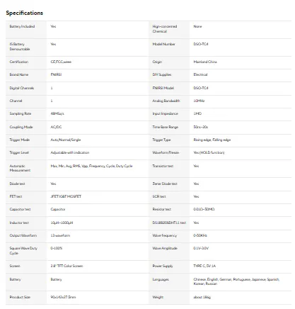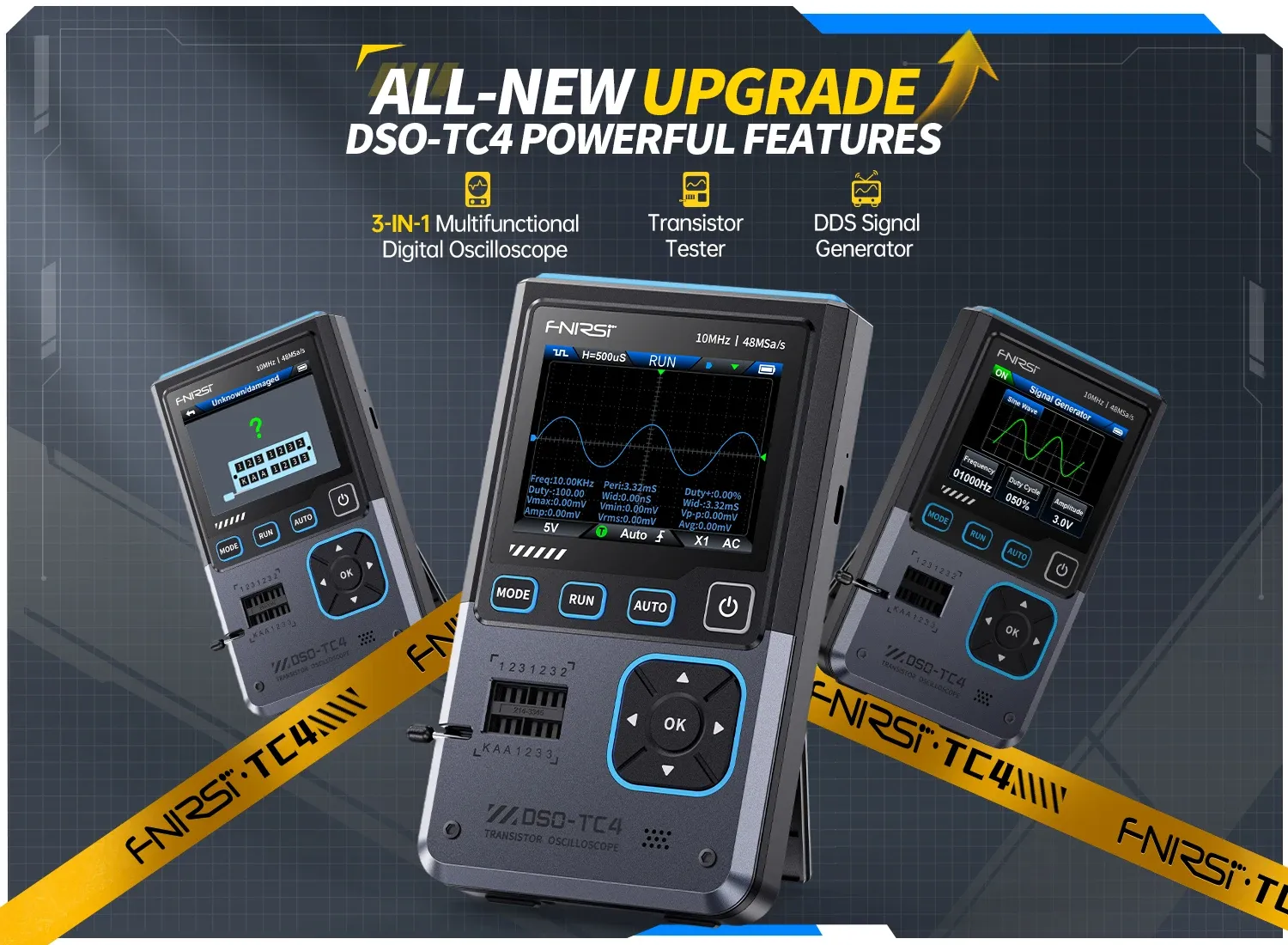 PRODUCT DETAILS OF FR DSO TC4 OSCILLOSCOPE DSO-TC4 is a multifunctional transistor oscilloscope launched by FNIRSI, which is comprehensive and practical, and is designed for the maintenance and R&D industries. It integrates an oscilloscope, a signal generator, and a transistor.