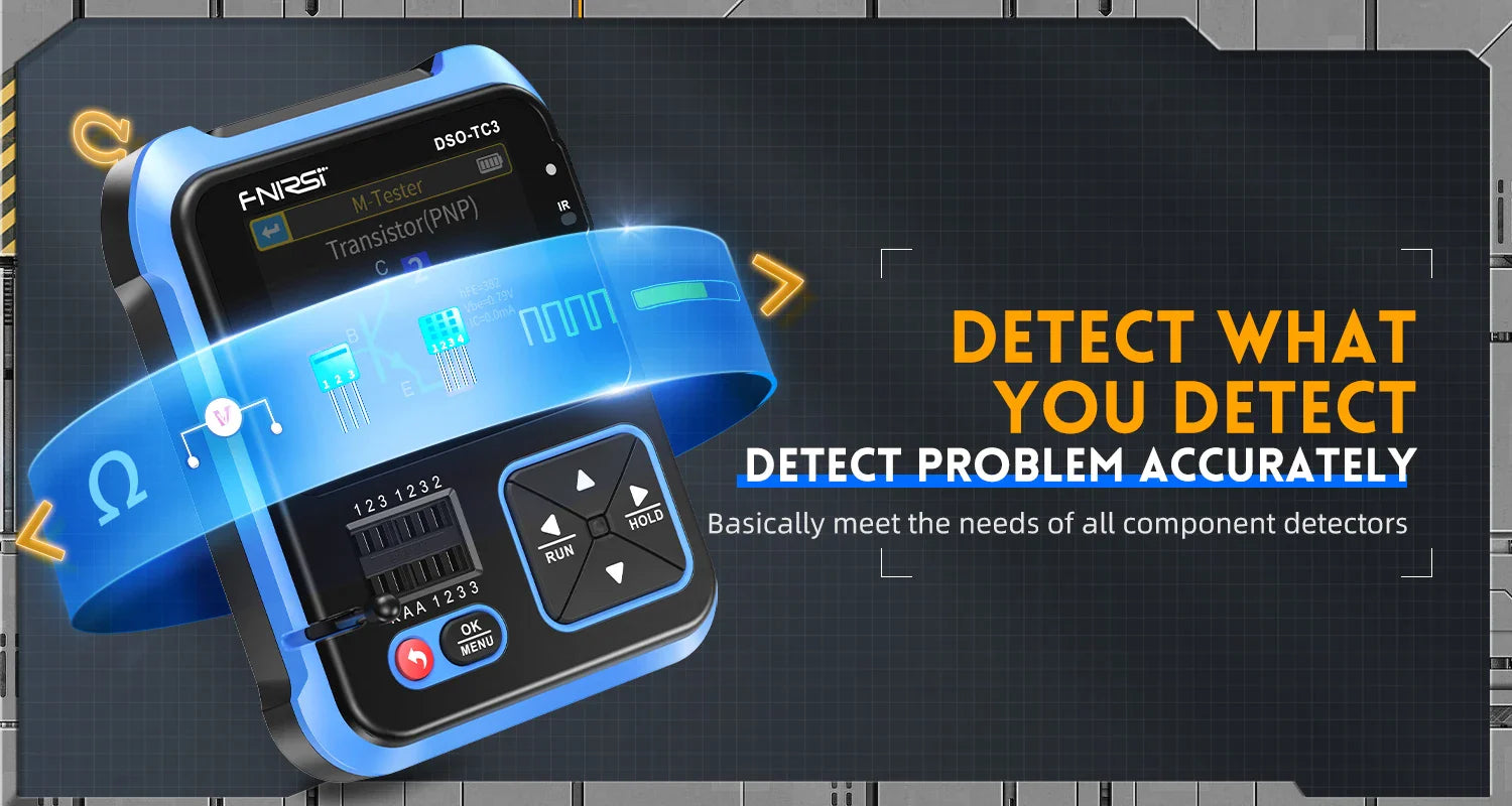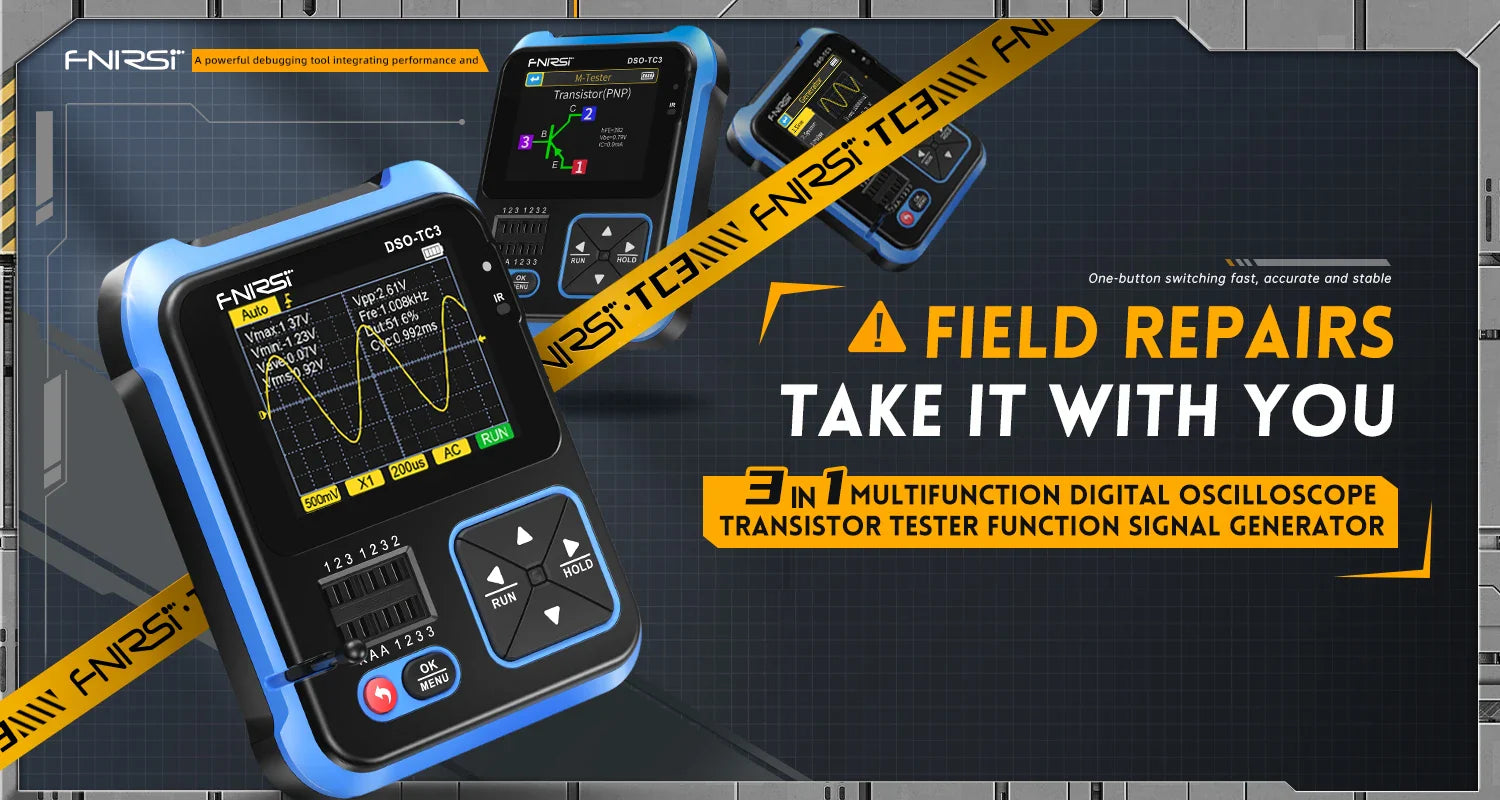 FNIRSI DSO-TC3 combines a digital oscillograph, electronic component tester, signal generator, continuity test, voltage test, temperature and humidity measurement, infrared decoding and other functions are skillfully integrated. It is equipped with a 2.4-inch color TFT display, built-in rechargeable lithium battery, brings users stronger and more practical functions with good portability.