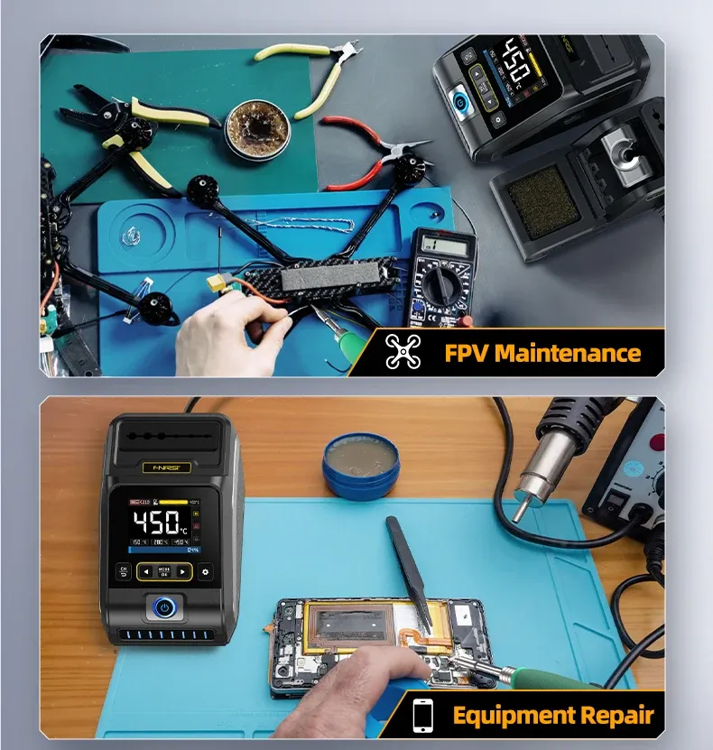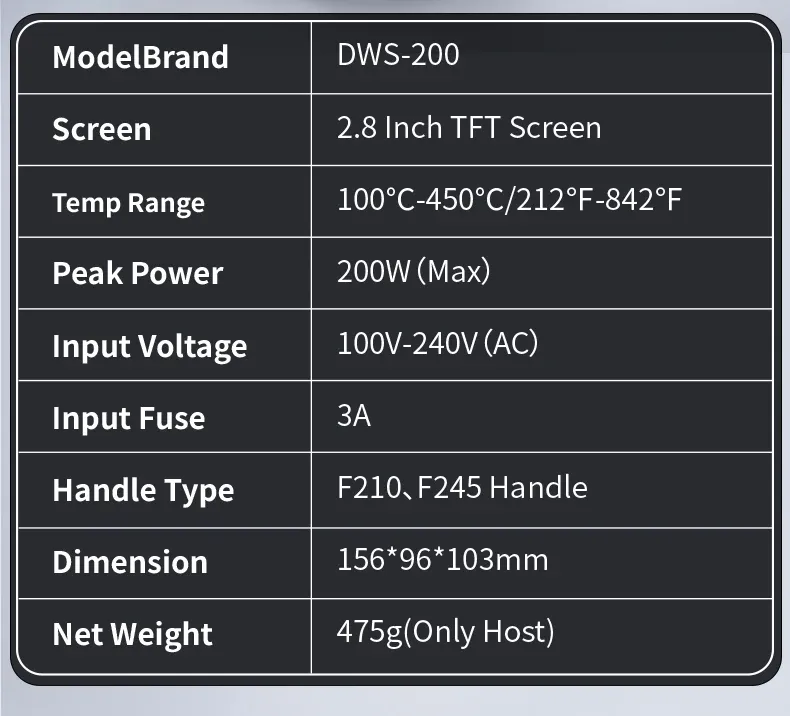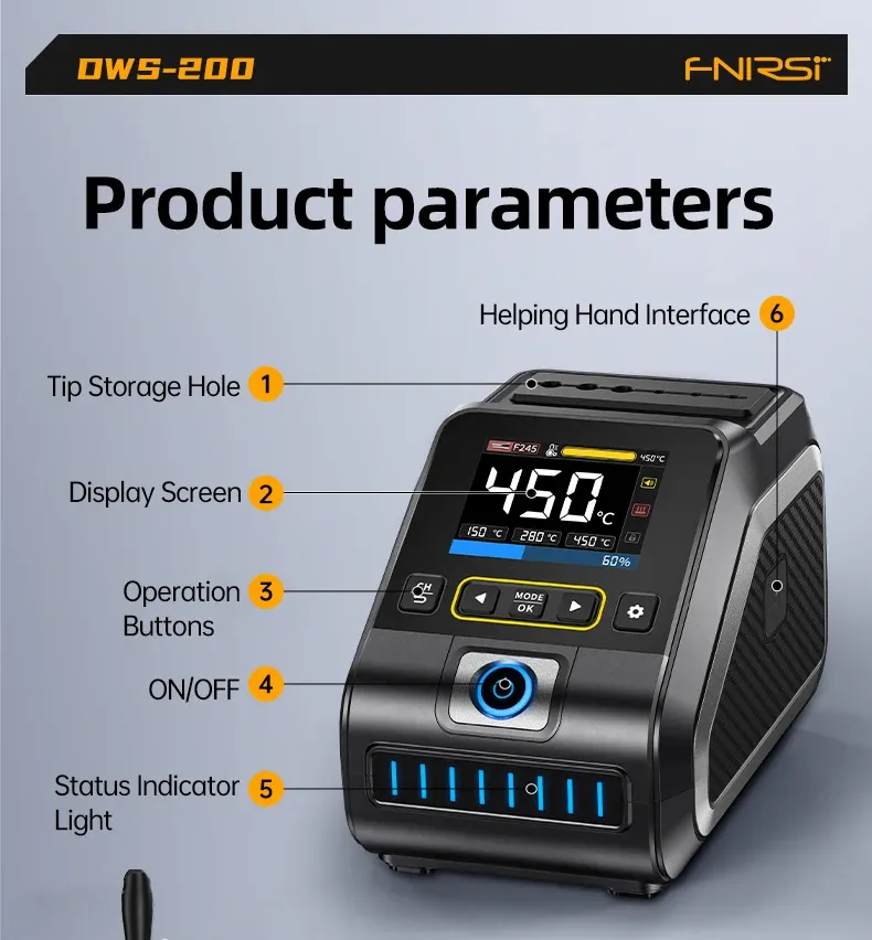 DWS-200 is a 200W high-power precision soldering station launched by FNIRSI. It is a commonly used hand tool in electronic soldering processes. This product has a built-in high-power pure copper transformer, suitable for 100-240V voltage input, with a maximum power of 200W. Supports conversion from ℃ to ℉, adjustable temperature range 100℃~450℃/212℉~842℉. It also supports preset 3 sets of temperature values and can be connected to a soldering iron stand for standby induction. Use dynamic temperature curve mode to try monitoring data