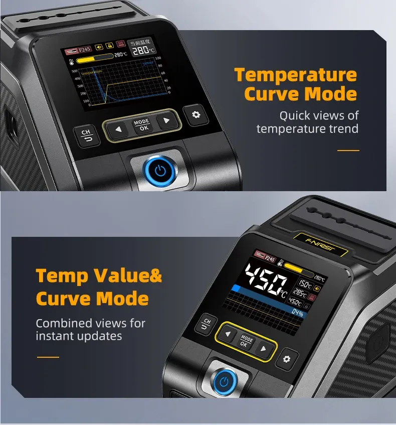 The soldering station features an advanced 4.8-inch TFT screen that displays real-time temperature readings, making it easy to monitor and control the soldering process. With a temperature range of 100℃ to 450℃, this station is suitable for a wide range of soldering tasks. The dynamic temperature curve mode enables real-time monitoring of power and temperature status, providing valuable insights for precision soldering. The soldering station is designed to extend the life of the soldering tip through real-time sleep mode, ensuring optimal performance and longevity.