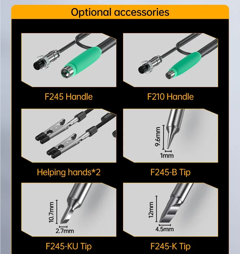 The FNIRSI DWS-200 soldering station comes with a variety of accessories, including a soldering iron stand for standby induction, helping hands, and multiple tips to cater to diverse soldering needs. The full set options include a complete set of tips, ensuring that users have the right tool for the job. Whether you're a professional or a hobbyist, this soldering station provides the convenience and efficiency required for precise electronic welding and rework.
