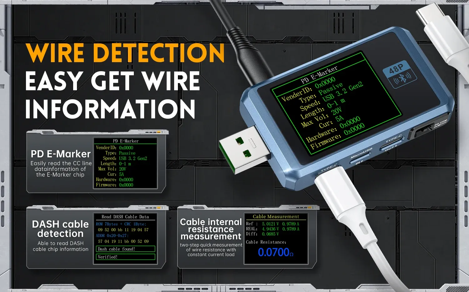 This product support read the data of E-Marker and DASH cable, and the chips of e-marker and DASH cables can be easily read after connecting the data lines.