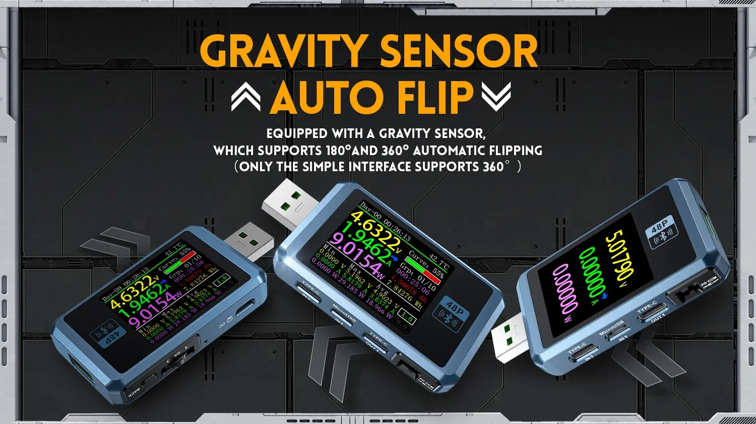 This product support screen flip function, through the gravity-induction, the screen can be free to flip, you can also turn off gravity-direction recognition and flip the screen by long pressing the middle key.