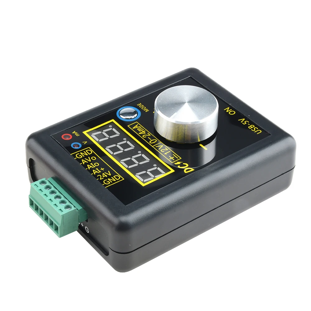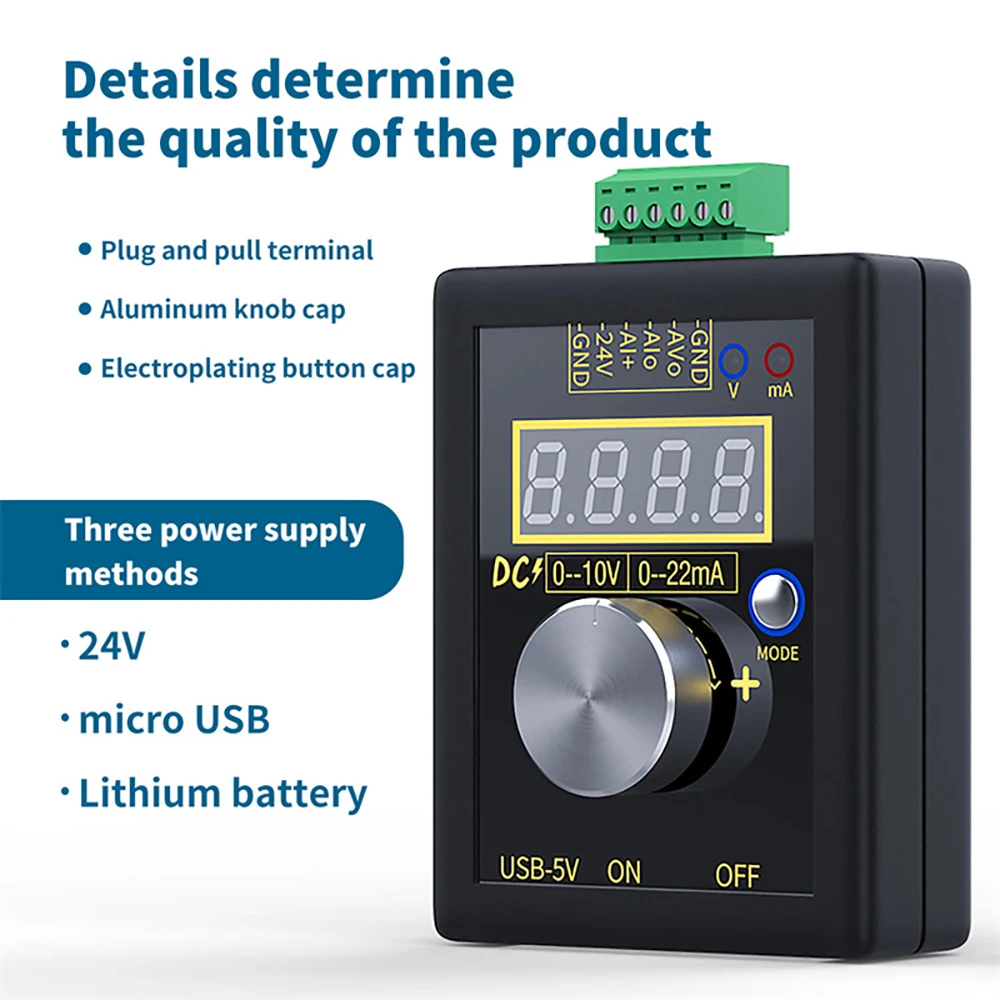 The voltage and current signal generator is the most commonly used electrical test instrument for electrical engineers and technicians during onsite installation, commissioning, overhaul and maintenance of electrical equipment.Pluggable terminal blocks, safe and convenient wiring.4-digit high-definition digital tube, the display brightness is evenly adjustable (1-8 brightness).Aluminum knob cap, electroplating button, high-quality film, charging indicator, battery switch.Three power supply methods: external power supply, DC5V micro USB, built-in lithium battery (only when type 1 is selected, the built-in lithium battery charging mode can be used). As long as you work all the way, you can also connect at the same time.DC 15-30V external power supply, which can share the 24V power supply of PLC and other equipment.MicroUSB universal interface, can be connected to mobile power, charger, computer USB port, etc.On the normal operation screen, save a voltage and current value, click the encoder to save, and after releasing the "OK" button, the screen displays "...", indicating that the save is successful. After restarting, the saved value will be displayed directly, and there is no need to adjust the parameters every time when starting up, which is very practical.Easy to carry and small in size, it is the best choice for on-site debugging.