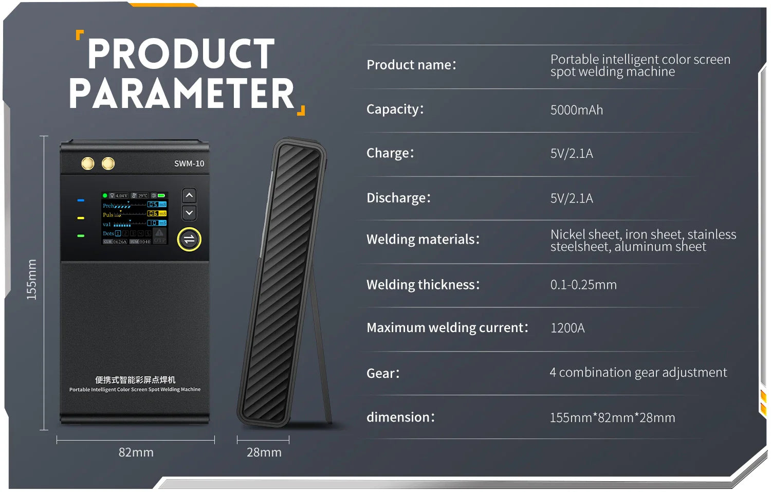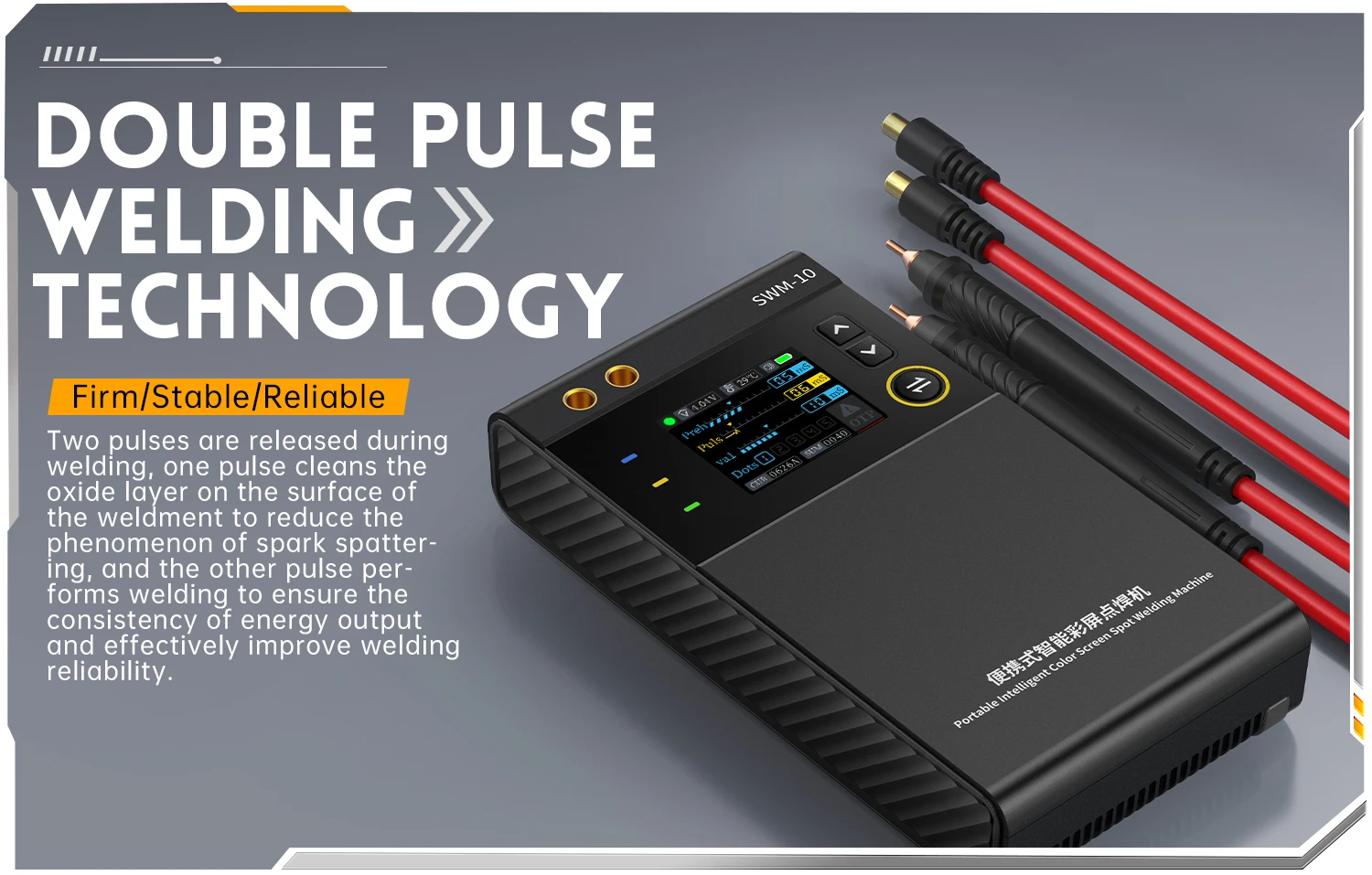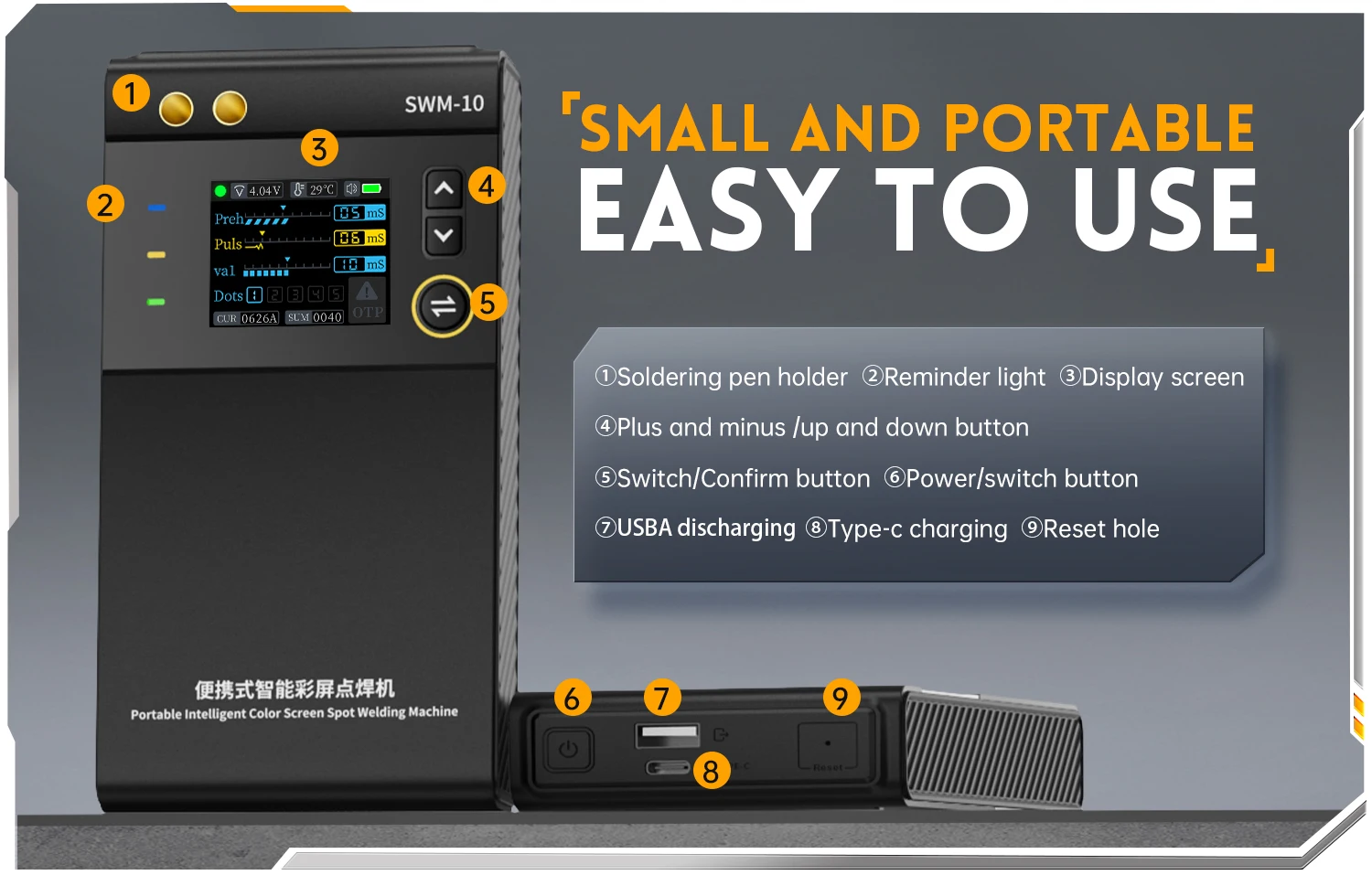●SWM-01 portable handheld spot welding machine is an efficient, convenient, and easy-to-carry spot welding tool.Double pulse spot welding technology is adopted to make the welding more stable and firm, and it also has the function of a power bank.