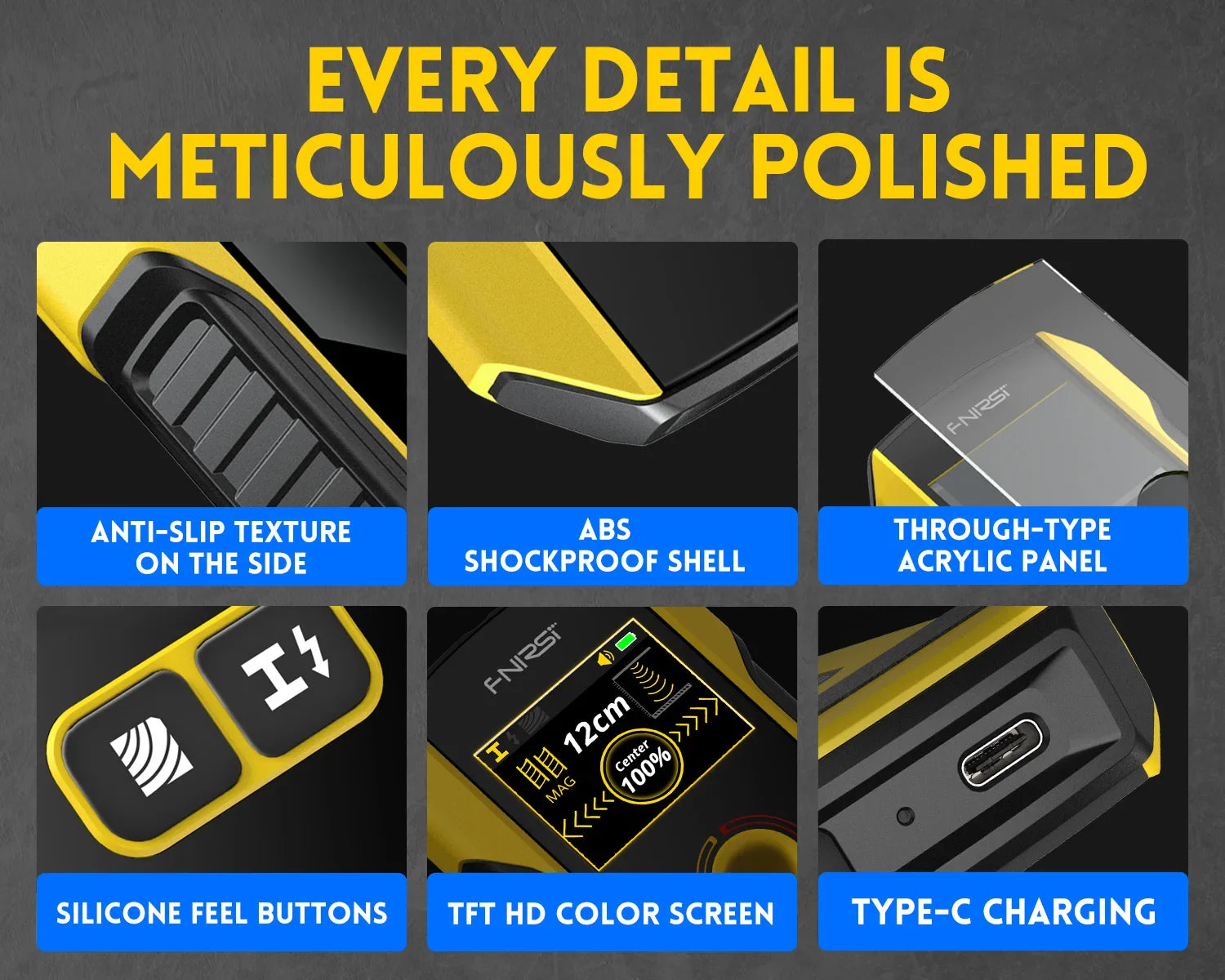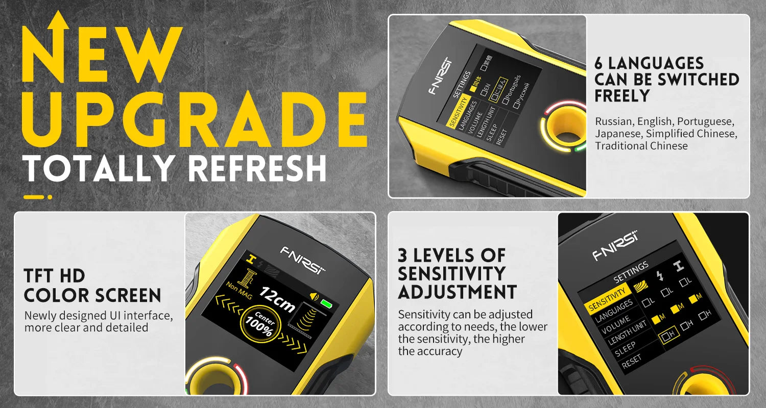 FNIRSI WD-02 Wall Detector is an upgraded version of WD-01, WD-02 has upgraded high-definition TFT display screen and new UI interface. Also added 6 languages: Russian, English, Portuguese, Japanese, Simplified Chinese, and Traditional Chinese. Its 3-level sensitivity adjustment makes the measurement accuracy higher. It can be used to detect steel bars, metal joists, metal pipes, wood, wires in walls, ceilings and floors. 3 detection modes are designed, metal detection mode, wood detection mode and AC detection mode to meet your different working needs. The brand-new positioning hole design is no longer afraid of drilling wires and steel bars. Widely used in interior decoration, home installation and other industries, so that various constructions can be carried out safely.