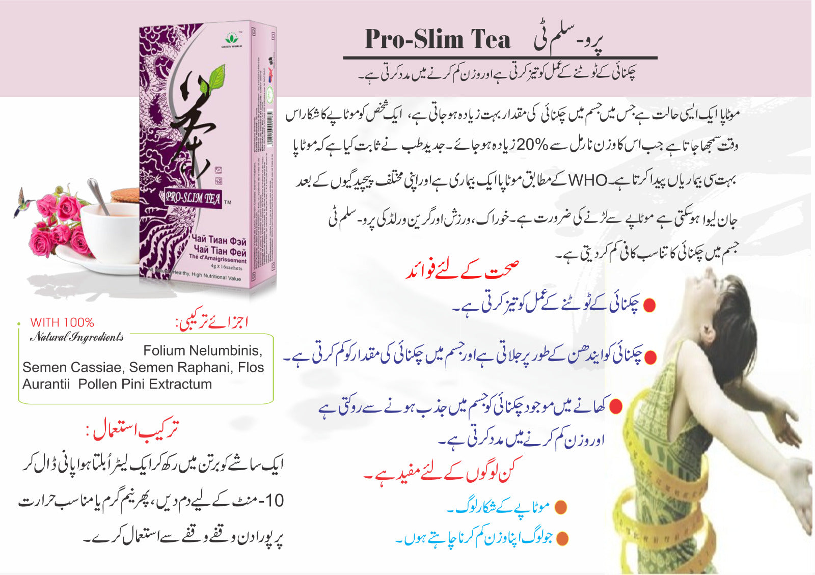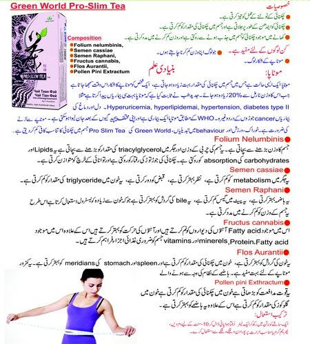 With Its Natural Herbal Compositions, Green World Pro-slim Tea Can Effectively Activate The Lipolytic Enzymes Which Accelerate Break-down And Burning Of The Fat. It Also Restricts Absorption Of The Fat From The Diet In Small Intestine. Long-term Consumption Can Reduce The Total Fat Deposit In Body And Assist In Weight Loss. Green World Pro-slim Tea Is Safe, Effective And Does Not Result In Weight Rebound.