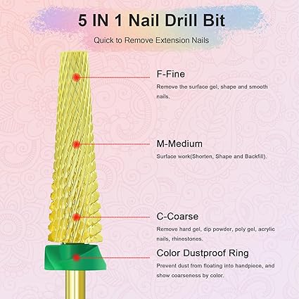 - 5 IN 1 Multiple Function Design: From top to the base of the carbide nail drill bit, the coarseness changes from 2X Extra Fine to Extra Fine, to Fine. The top teeth can reach nail edges to remove dead skin without cutting the skin around. 2X Extra Fine grit is for the nail areas near the skin; Extra Fine grit is for the nail middle areas, reaching tight areas to clean cuticles and sidewalls of the nail; and Fine grit is for removing the surface gel, shape, and smooth nails.