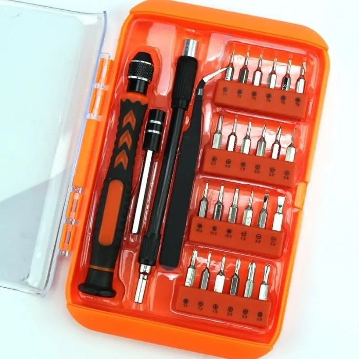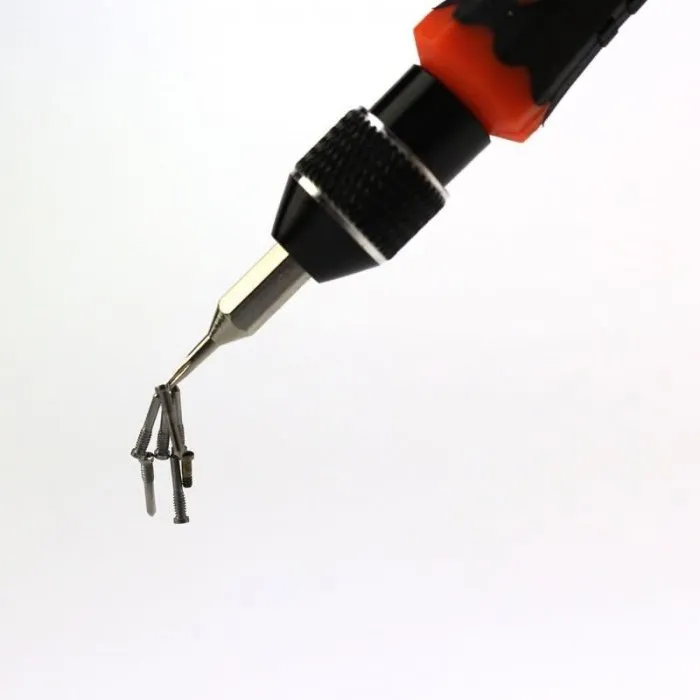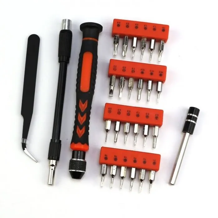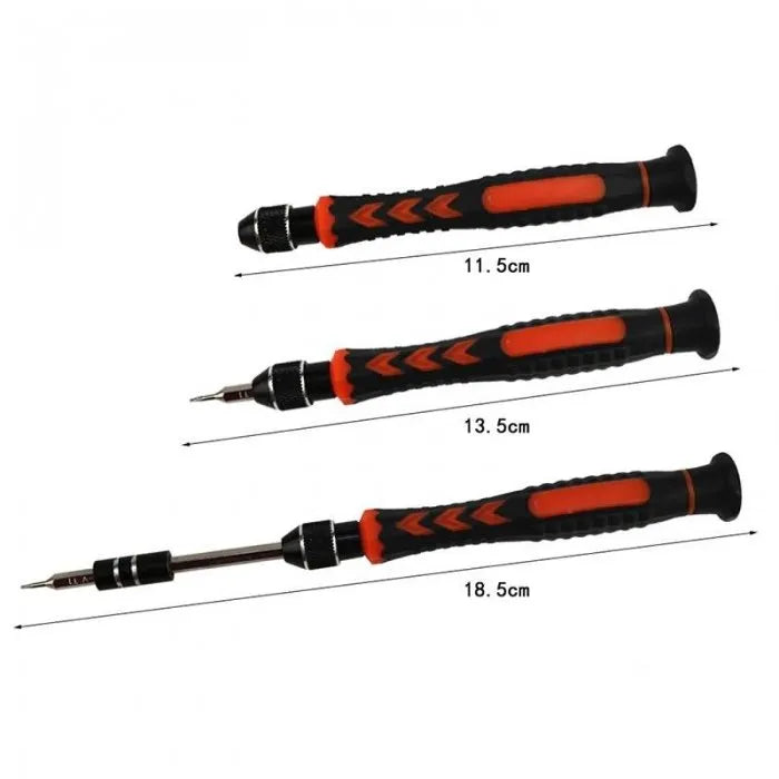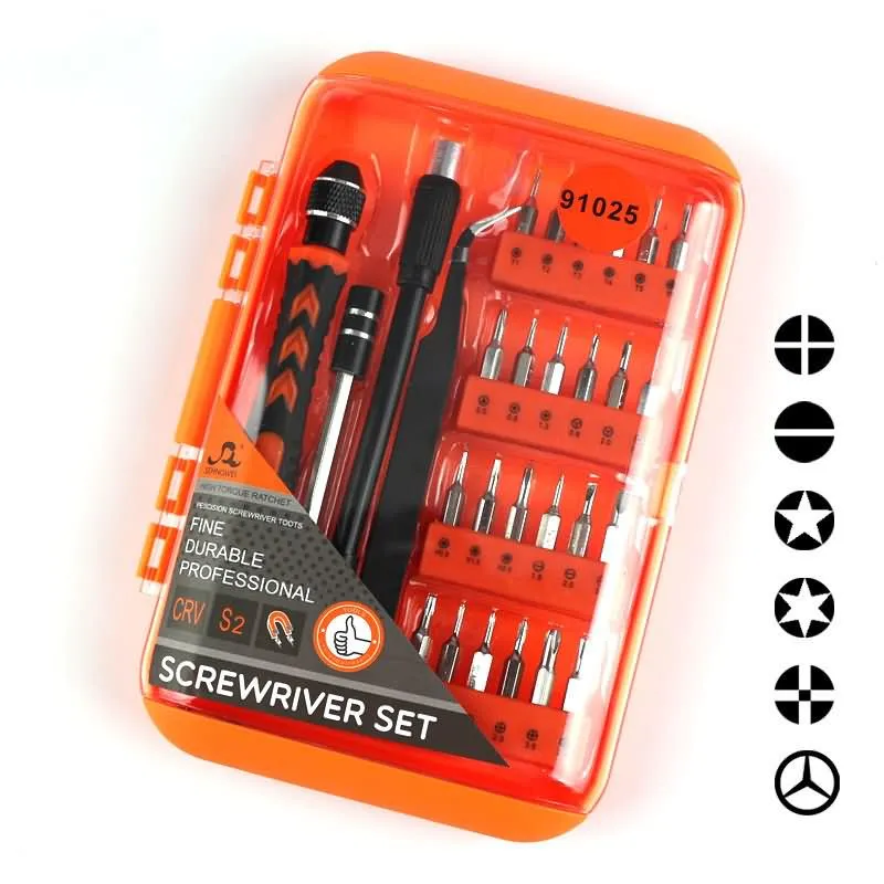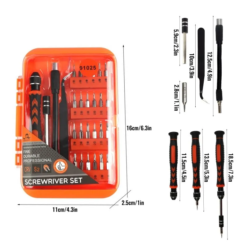 Model: 91025Material: S2 Alloy SteelWeight: 213gQuantity: 28 pieceLength: 115-185mmBit length: 28mm1 x Screwdriver handle1 x Extension hose1 x Extension rod1 x TweezersScrewdriver head:4 x “+” (Cross Screwdrivers)(1.2/1.5/2.0/3.5mm).3 x “-” (Flat-blade Screwdrivers)(1.2/2.0/3.0mm).2 x “★”(Five-star Screwdriver) (0.8/1.2mm) .7 x “✷”(Torx Screwdriver) (T1/T2/T3/T4/T5/T6/T7).3 x Hex screw driver:H0.9, H1.5, H2.02 x “Y” (Y-type Screwdriver) (0.2/0.6mm).1 x 2.5mm Phillips screwdriver to open screws onLogic BoardProduct size: 16*11*2.5cmCarton size: 55*35*37CM