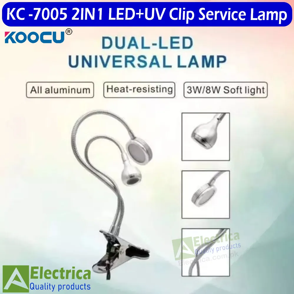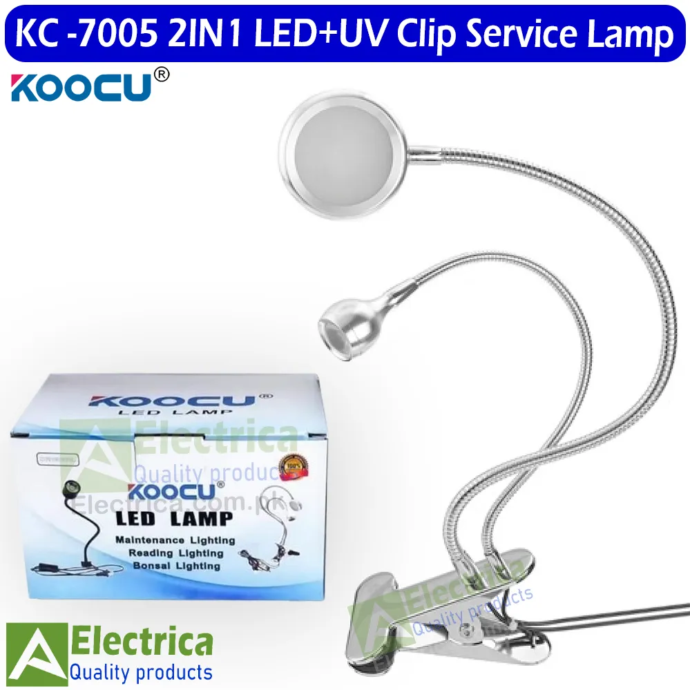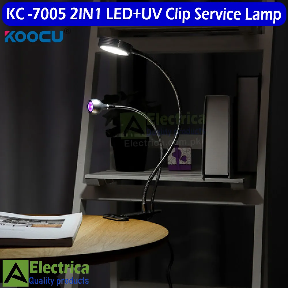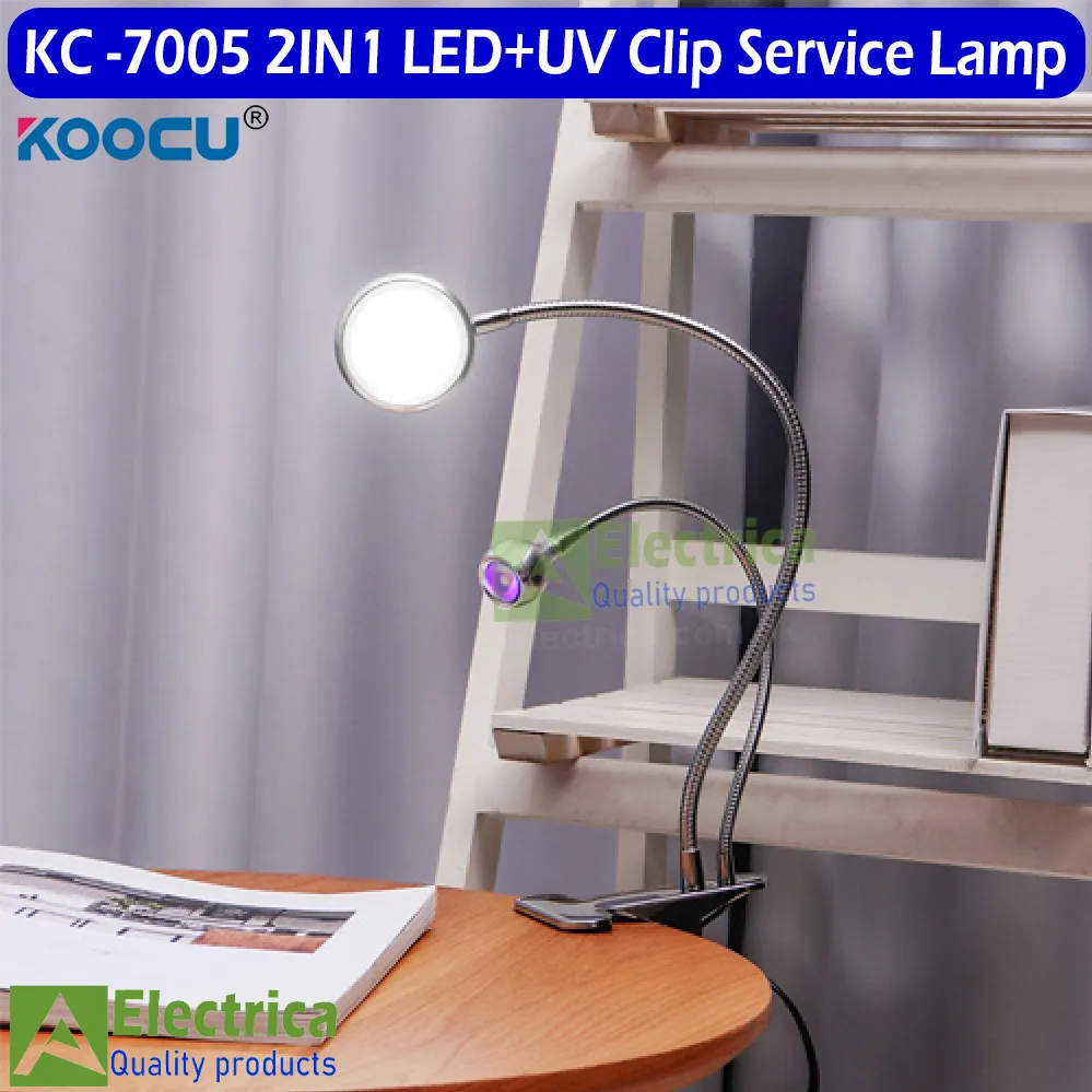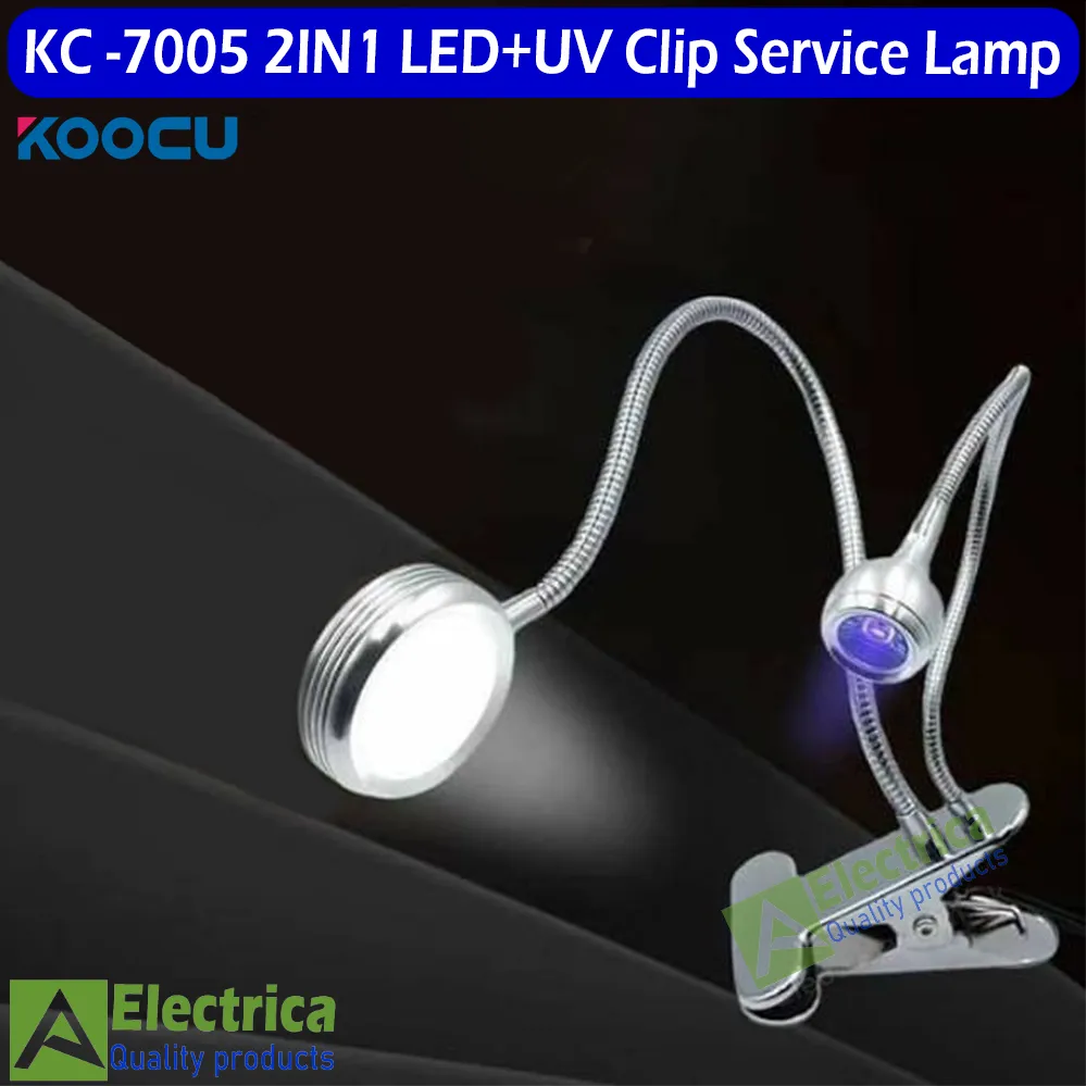 Introducing the LED+UV Clip Service Lamp by KOOCU 7005, a versatile 2-in-1 multipurpose LED clip lamp designed for mobile accessories and replacement parts. This innovative lamp features a combination of LED and UV light, making it ideal for various service and repair tasks. The clamp table design offers flexibility and convenience, allowing you to position the light exactly where you need it. Whether you're working on mobile devices or other electronic components, this lamp provides reliable illumination for precision work.