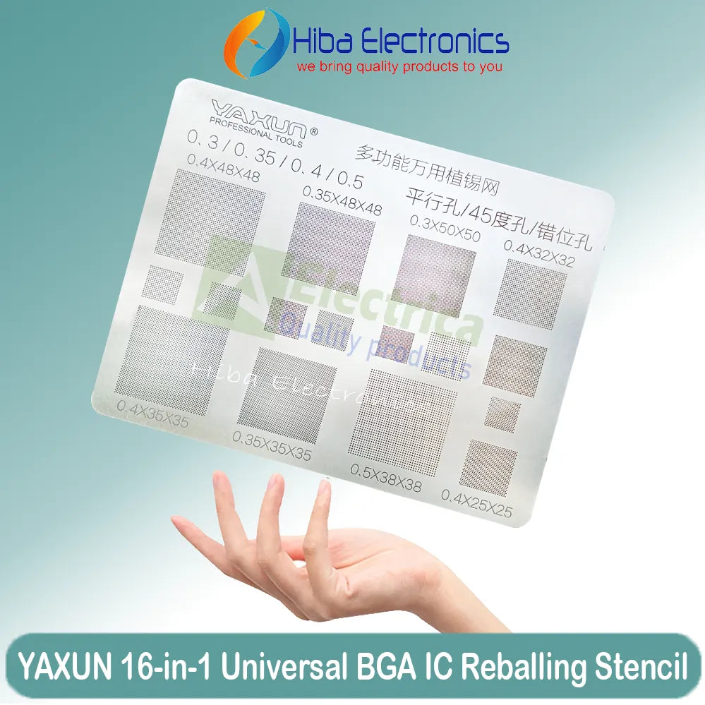 Introducing the YAXUN Multi-Purpose BGA Stencil, a versatile tool designed for reballing and soldering tasks. This stencil features a range of hole sizes including 0.3, 0.35, 0.4, and 0.5, as well as parallel and 45-degree hole configurations, providing flexibility for various soldering needs. Ideal for mobile and tablet repair, this universal solder stencil ensures precise and efficient reballing processes. Whether you're a professional technician or a DIY enthusiast, this BGA stencil is an essential addition to your toolkit.