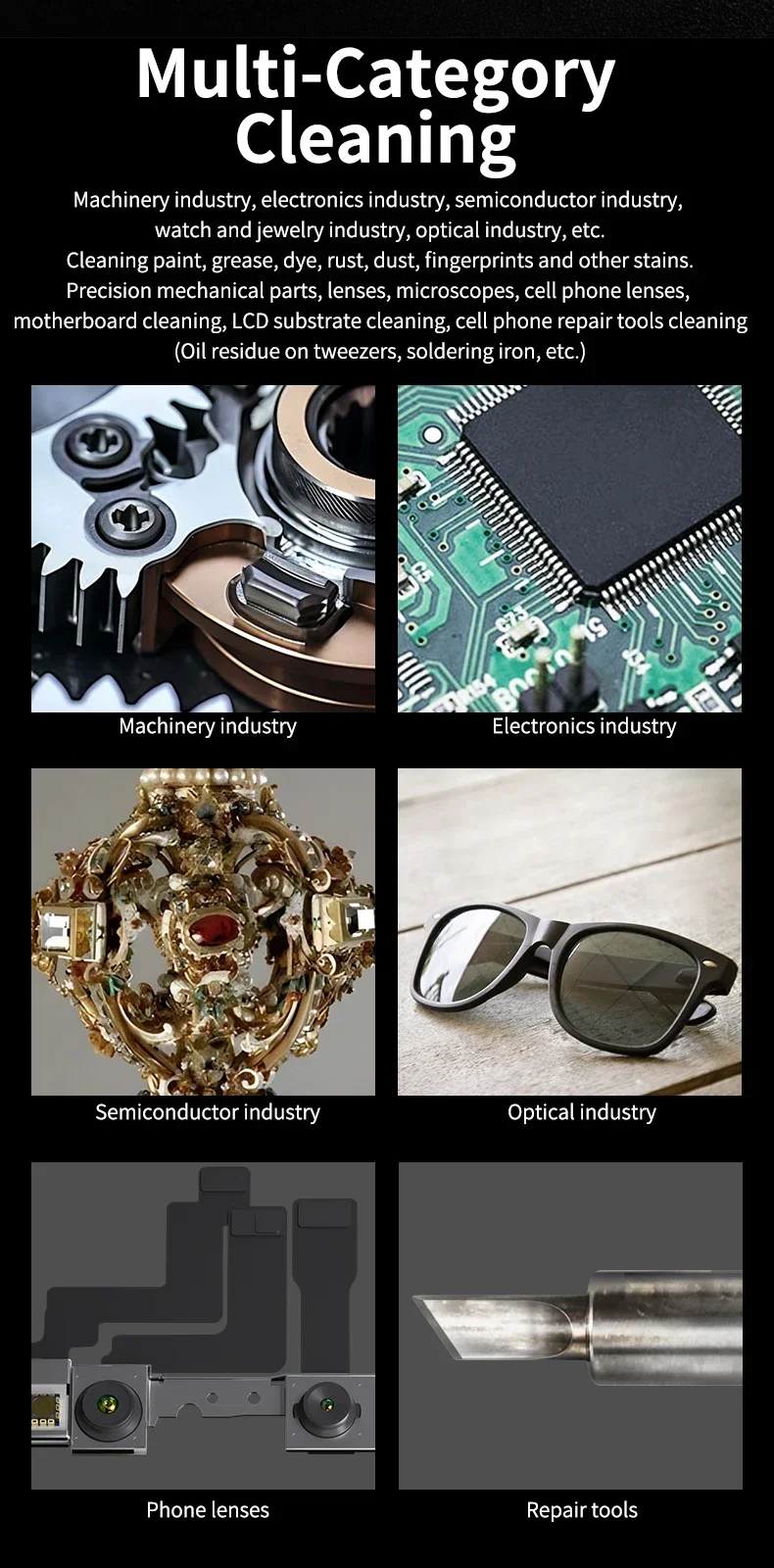 Suitable for precision components such as lenses, microscopes, mobile phone motherboards, LCD substrates, and maintenance tools like tweezers and soldering iron tips.
