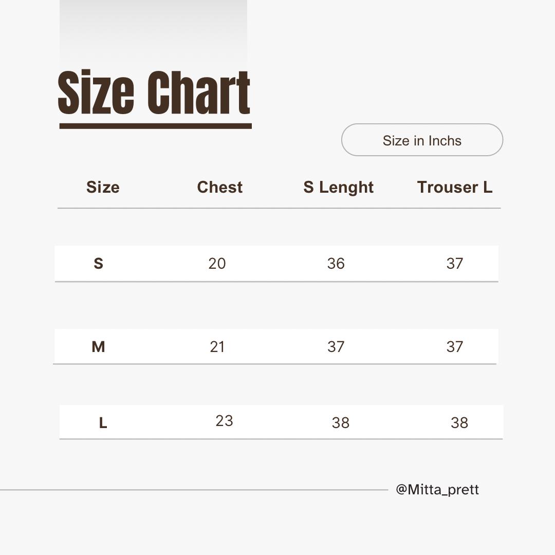 Medium: Shirt (Chest 20, Lenght 38), Trouser (Lenght 37) Inches